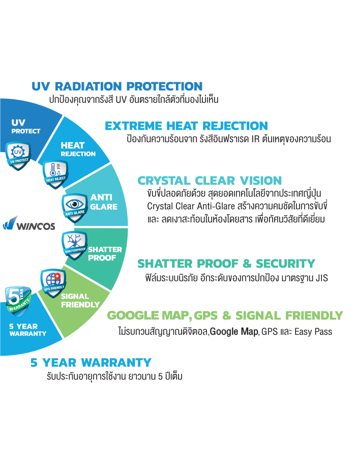 WINCOS Premium Series ฟิล์มติดรถยนต์ระดับพรีเมียมที่ให้วิสัยทัศน์ชัดเจนจากเทคโนโลยี Anti Glare Technology ที่ลดแสงสะท้อนภายในห้องโดยสาร ให้การขับขี่ที่ปลอดภัยทุกสภาวะแสง และเหนือกว่าไปอีกขั้นของความปลอดภัยด้วยเนื้อฟิล์มแบบ ShatterProof ป้องกันอันตรายจากการแตกร้าว ตามมาตรฐานของประเทศญี่ปุ่น หมายเหตุ : WINCOS Premium Series ผลิตด้วย นาโนเทคโนโลยี ดังนั้นเนื้อฟิล์มจะไม่รบกวนสัญญาณ GPS, Easy Pass, Google Map
